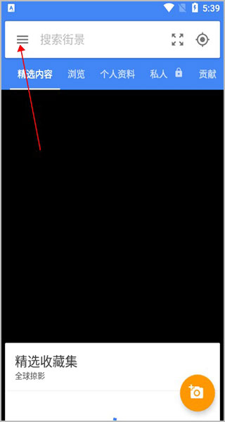 1、下载安装谷歌街景地图,打开后首先可以在上方搜索街景,单击左上角三杠进入菜单;