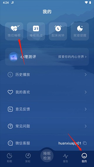1、打开幻休app,点击我的,通过情侣睡眠就可以和别人联机;
