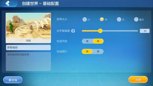 进入自定义界面后可以对这个世界进行初步的设置,根据自己的需要选择世界的大小、水平面高度,同时如果想在自己的世界中加入河流和洞穴的话也可以在这里进行设置哦!