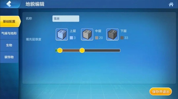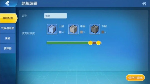 在基础配置中,我们可以对地貌的名称以及填充层厚度的数值进行修改,如果我们需要一个上部冰层较厚的雪原,那么我们就能通过向右拖动积木下方的黄色圆点来增加上层积木的数量。