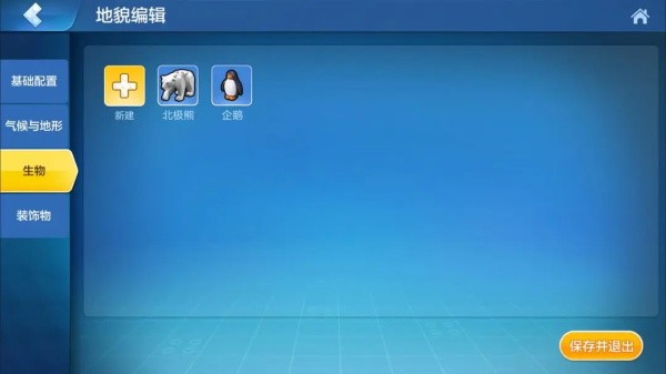 我们的雪原中似乎还少了些生气,让我们打开生物选项就能给我们的世界中添加动物和怪物啦!在我们的雪原中显然不能生存鸡鸭牛羊和小猪猪,所以我们可以把它们移除。然后选择新建功能,选择可爱的企鹅和北极熊把他们添加进来!
