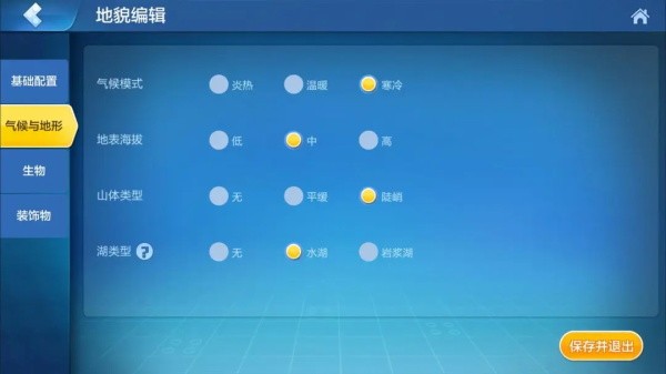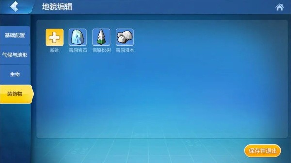 进入雪原地貌的编辑界面后,我们可以看到有基础配置、气候与地形、生物以及装饰物这4个方向可做调整。