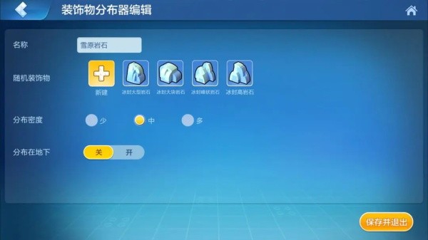 最后我们可以在装饰物中选择不同的特殊积木来对地貌中进行装饰,在雪原模板下会默认加入雪原岩石、雪原松树以及雪原灌木,点击这三个积木进行编辑能够对这几类积木进行更为细节的调整。