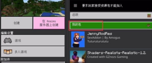 6、然后在左侧找到资源包,然后在点击右侧的“我的包”就可以看到珍妮模组,点击激活。