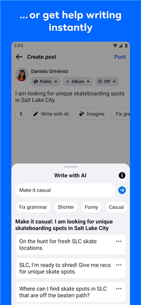 5. 内置的“MetaAI”工具能够支持生成人工智能内容,优化文案撰写,回答问题,帮助用户快速创建帖子或解决需求,并降低内容创作的门槛。