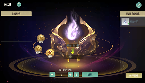 高等级的器魂可以拆分为次一级的2个器魂,1级器魂无法拆解。