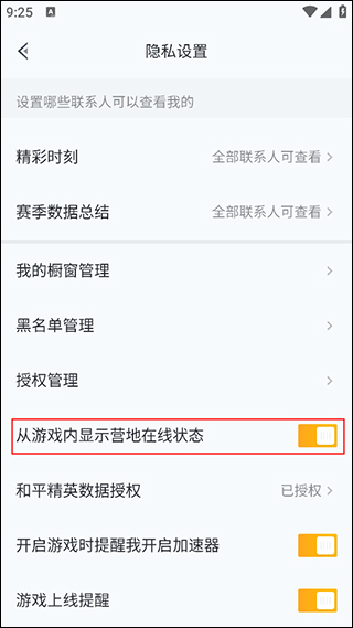 3、进入到隐私设置页面,向下滑动屏幕找到“从游戏内显示营地在线状态”把它右侧的开关按钮关闭即可。