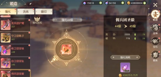 徽印镶嵌为第三重属性拓展维度。每件装备设有独立徽印槽位,镶嵌相同星级的徽印可触发“印记奖励”;当全部槽位填满同星级徽印时,额外激活套装徽印效果。徽印主要通过限时运营活动产出,集齐指定数量后可解锁专属套装属性。需特别注意:徽印激活存在装备星级与阶级双重门槛,且更换装备时徽印无法自动继承,必须手动拆卸并重新镶嵌。宝石系统提供第五维战力补充——每件装备支持镶嵌5颗不同种类宝石,宝石等级越高,基础属性加成越显著,是后期战力突破的关键支点。